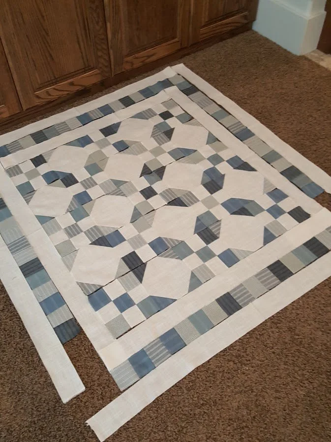 Traditional Nine Patch Blocks connect with a Snowball (or soccer ball, or basketball) block using the stitch and flip technique to achieve this design. The six or seven dark fabrics chosen for this quilt resemble the dress shirts we sometimes see big boys wear to the office and can be found in our stashes, charm packs, or jelly rolls.